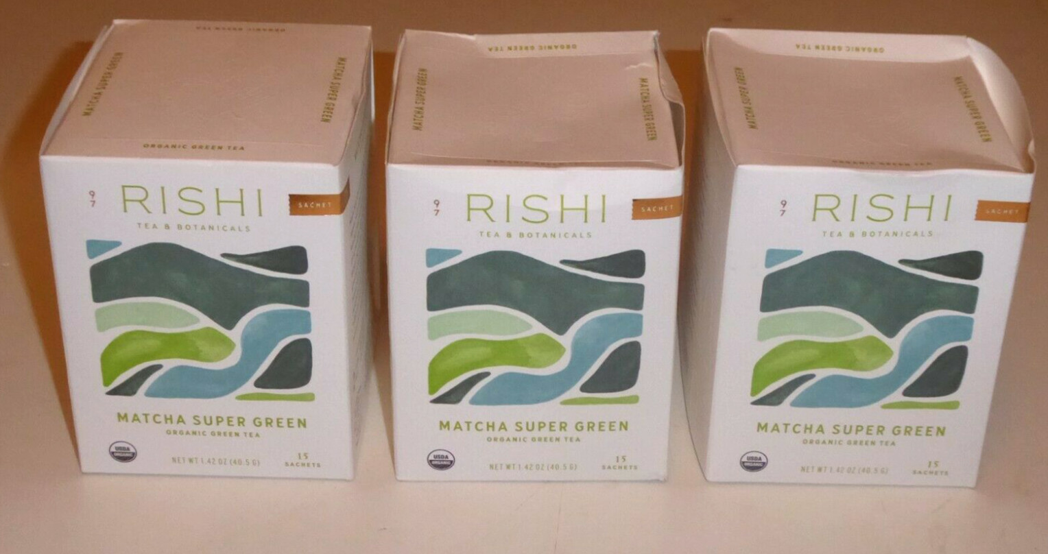 (3) boxes RISHI TEA sachets bags MATCHA SUPER green tea July 22 box damage
